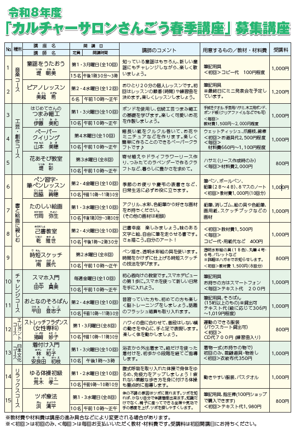 令和8年度「カルチャーサロンさんごう」春季講座を5月から開講します。